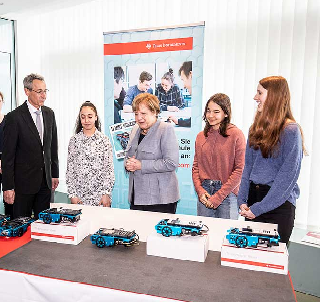 Zum Auftakt des Girls‘ Day 2019 präsentierten drei Schülerinnen des Primo-Levi-Gymnasiums in Berlin, begleitet durch Mirco Tewes und unterstützt von Texas Instruments, ein alltagsnahes MINT-Projekt im Kanzleramt. An einer von acht Stationen des Technik-Parcours zeigten sie Bundeskanzlerin Angela Merkel, wie autonomes Einparken funktionieren kann.
